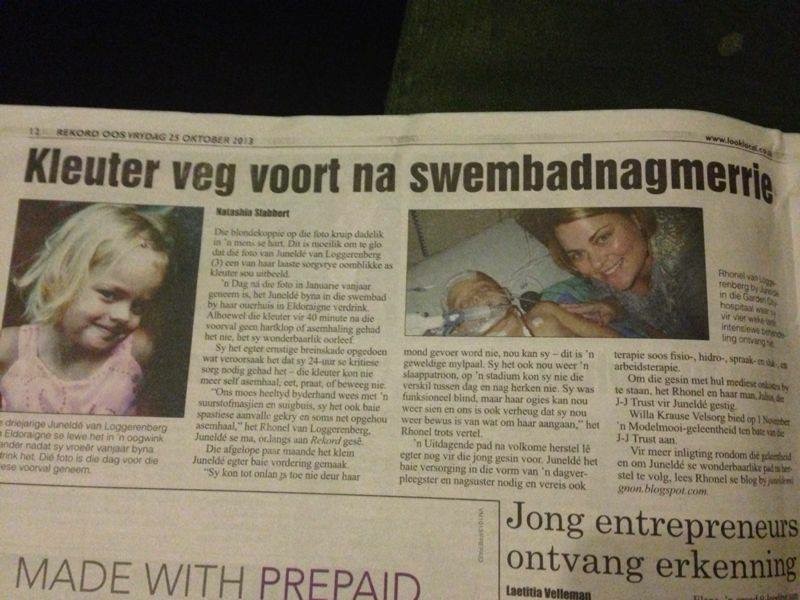 I see myself next to her ICU bed, with protruding tubes and an array of medical interventions, and I see my smile. I remember the despair, shock and utter disbelief in my heart. However the moment the camera is pointed towards me I put on a smile. It is a reflex almost, cultivated through years of classical conditioning. This photo appeared in the newspaper shortly after Juneldè’s accident.